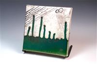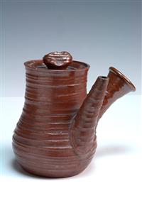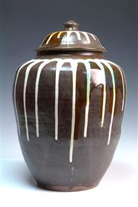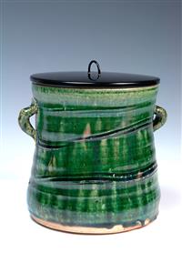 A COLLECTION OF EIGHT JAPANESE POTTERY OBJECTS, including tea pot, Kutani ware square vase, drip glazed dish, three lidded pots, five sake cups and an oribe tile