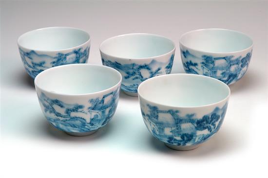 A SET OF FIVE BLUE AND WHITE BOWLS AND AN ASSOCIATED TEAPOT, The teapot 7.5cm high