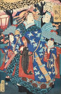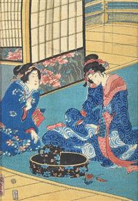 TWO FRAMED PRINTS ON CREPE SILK, both domestic scenes 39 x 30cm