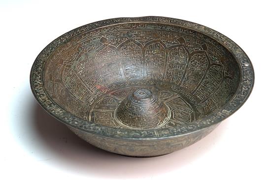 AN ISLAMIC CEREMONIAL VESSEL, with Arabic text incised over interior and exterior of bowl, a raised knob to centre 15 x 5cm