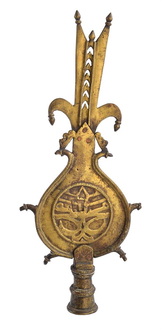 A COPPER AND BRASS CEREMONIAL ALAM FINIAL, 45cm high