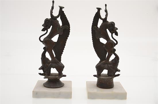 TWO BRONZE YALI OIL LAMP BASES, standing on an Elephant, its trunk meeting Yali's tail 23cm high