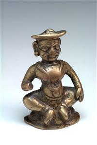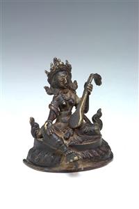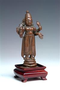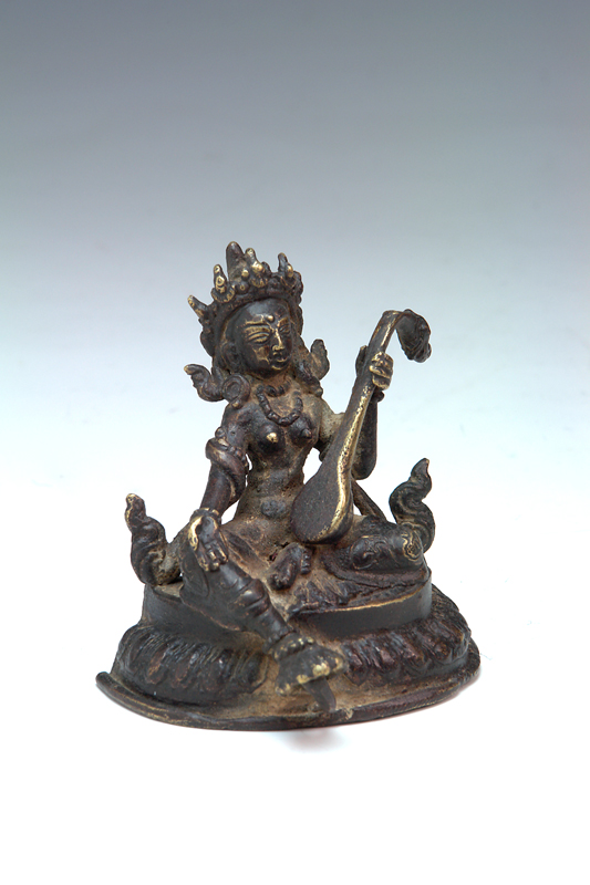 FOUR 18TH CENTURY CAST METAL FIGURES, including bronze Sarasvati, Vishnu, seated diety and horseman. The Vishnu is 12.5cm high