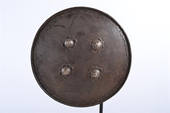 A 19TH CENTURY INDO-PERSIAN SHIELD, with four star studs and etched warrior motif
