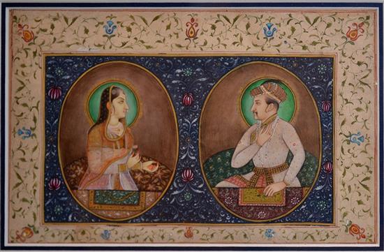 AN 18TH CENTURY MINIATURE DEPICTING EMPEROR JAHANGIR & CONSORT BIBI MUMTAZ, Urdu text to verso 35.5 x 25.5cm with frame