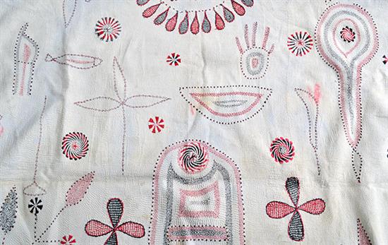 A BENGALI FOLK ART KANTHA CLOTH, cotton with embroidered leaves, fish, butterflies and wheels 170 x 117cm