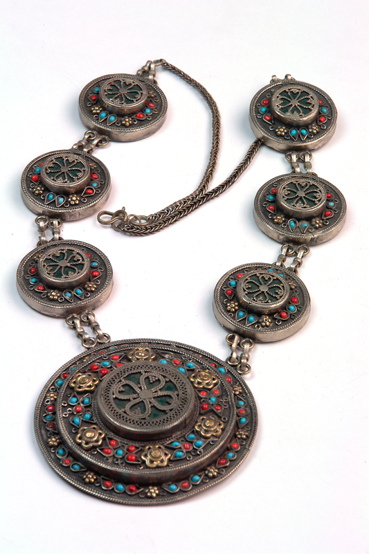 A INDIAN SILVER FILIGREE NECKBAND, six small and one large medallion set with small turquoises and corals, on snake chain 38cm long
