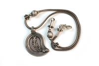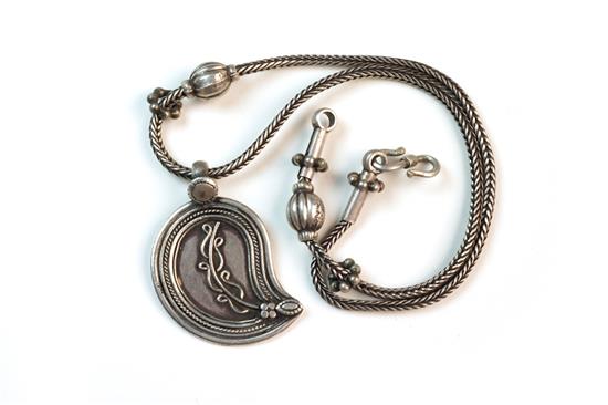 FOUR SILVER NECKLACES, including leaf shaped amulet, heart shaped amulet, oval shaped pendant and one other The longest 46cm, with pendant