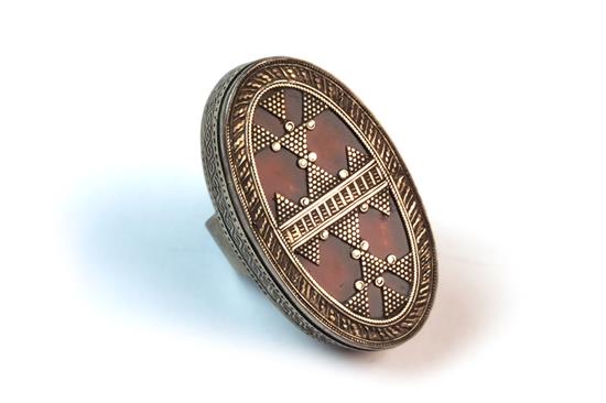 TWO TURKOMAN SILVER RINGS, finely worked beaded faces, one with brown glass underneath
