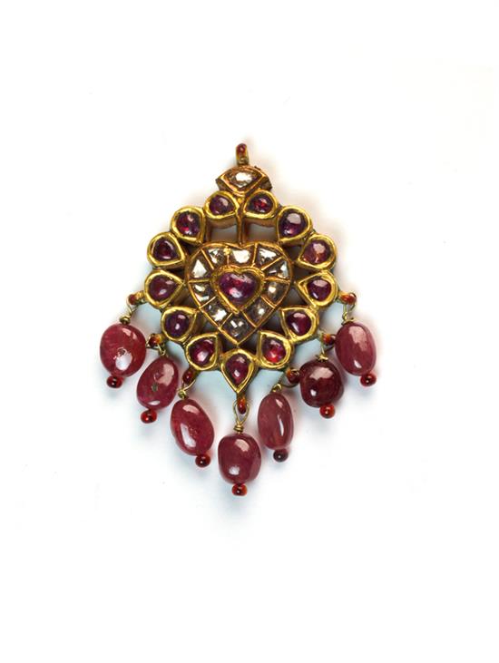 AN ENAMELLED 22CT GOLD PENDANT, JAIPUR RJAHSTAN , set with twelve rubies and ten table cut diamonds