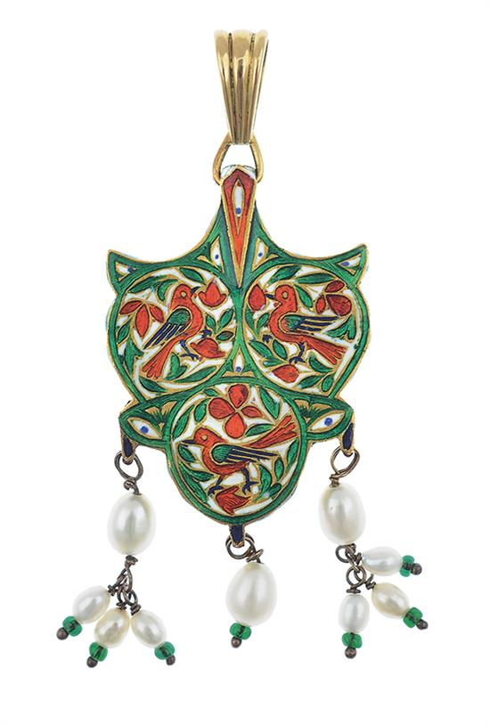 A 24CT GOLD PENDANT, SET WITH CARVED EMERALDS, with foil backing, six rose-cut diamonds, nine pearls, enamelled at back