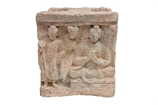 A GANDHARA STONE RELIEF, depicting diety and two attendants 22 x 20cm