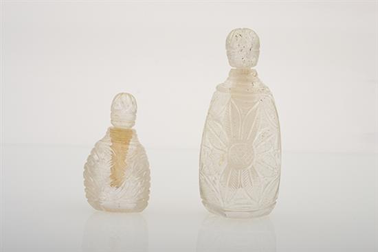 TWO SIMILAR CARVED ROCK CRYSTAL PERFUME BOTTLES, The largest 11.5cm high
