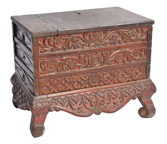 AN INDIAN WOOD CARVED MINIATURE CHEST,
