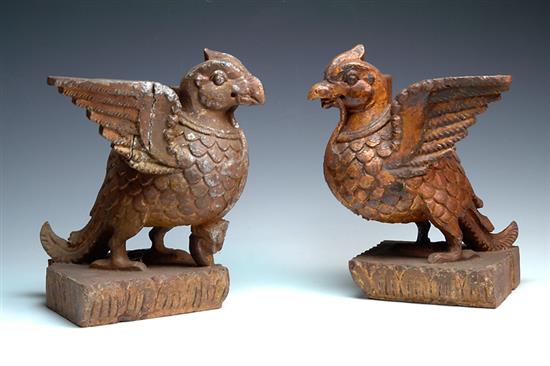 A PAIR OF 19TH CENTURY INDIAN GILT WOOD BIRDS, with old repairs 22cm high