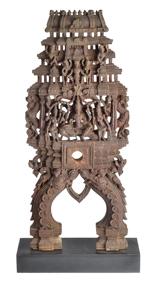 A FINELY CARVED 19TH CENTURY KATHAKALI DANCERS HEADPIECE, KANATAKA, SOUTH INDIA, modelled with deities and attributes 59cm high