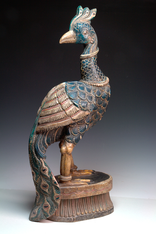 A LARGE SOUTH INDIAN POLYCHROME PEACOCK, wood carved 64.5cm high