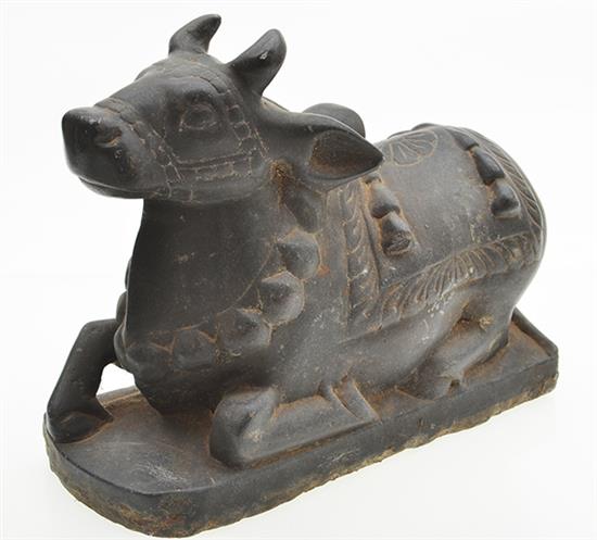 A SOUTH INDIAN BLACK BASALT NANDI BULL, carved neckband, saddle and bell-shapes 33cm long, 20cm high