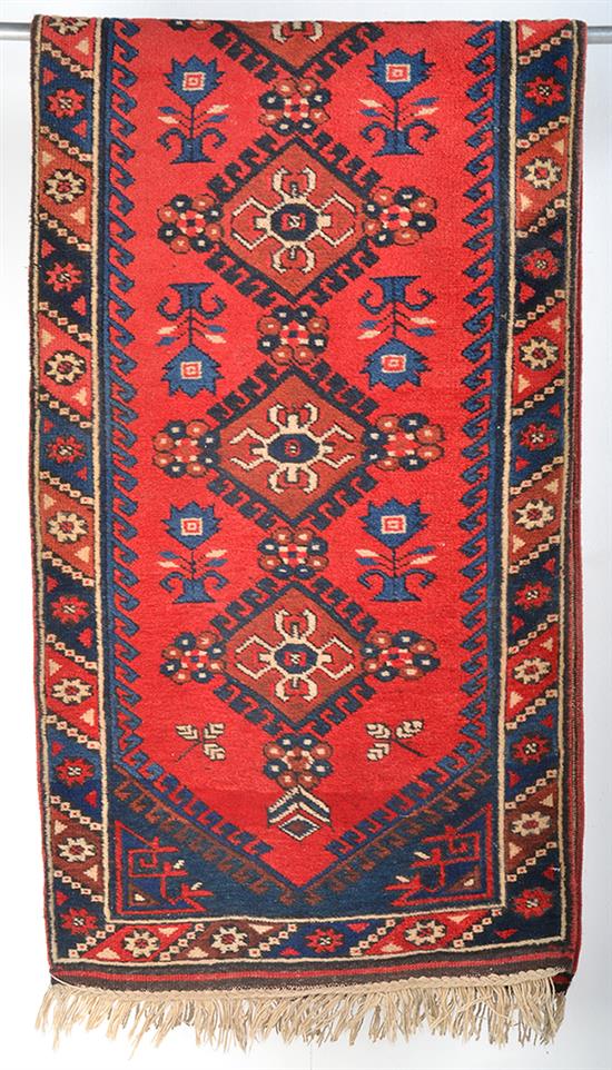 A TURKISH WOOL RUNNER red and blue ground, 281 x 76cm, excluding tassels