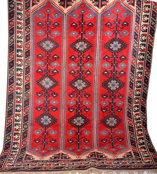A TURKISH DOSEMEALTI RUG, three central floral panels, geometric borders 192 x 102cm, excluding tassels