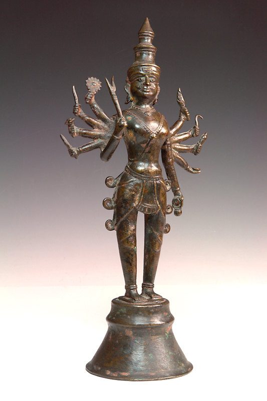 AN 18TH CENTURY SOUTH INDIAN BRONZE VIRABHADRA, with ten arms, attributes in hands, triple-tiered turban on head, cast necklaces, elongated ears