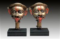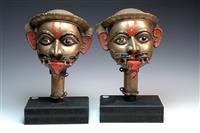 A PAIR OF BRASS HEADS, KARNATAKA, SOUTH INDIA, modelled as Shiva with prominent facial features, and applied brass moustache, wear to paint work 49.5cm high each, base not measured