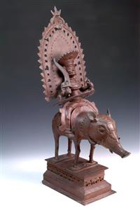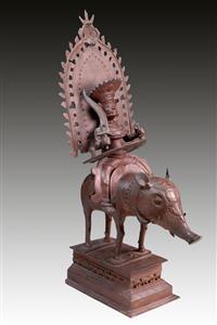 A LARGE IRON SOUTH INDIAN DEITY ON A BOAR, sword and bell in hands 63.5cm high