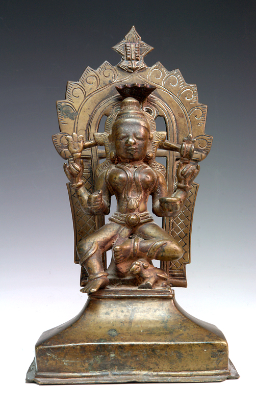 A BRONZE FIGURE OF MAHESHWARI ON A PEDESTAL, with ceremonial arch at back, lotus, drum & bowl in hands, cobra hood above head & a makara head at apex arch, 24cm high