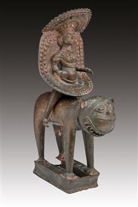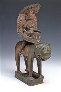 A TRIBAL DEITY ON A TIGER, tail missing, old repair to mandorla, collected from the Kerala-Karnataka border region 29cm x 16.5cm wide