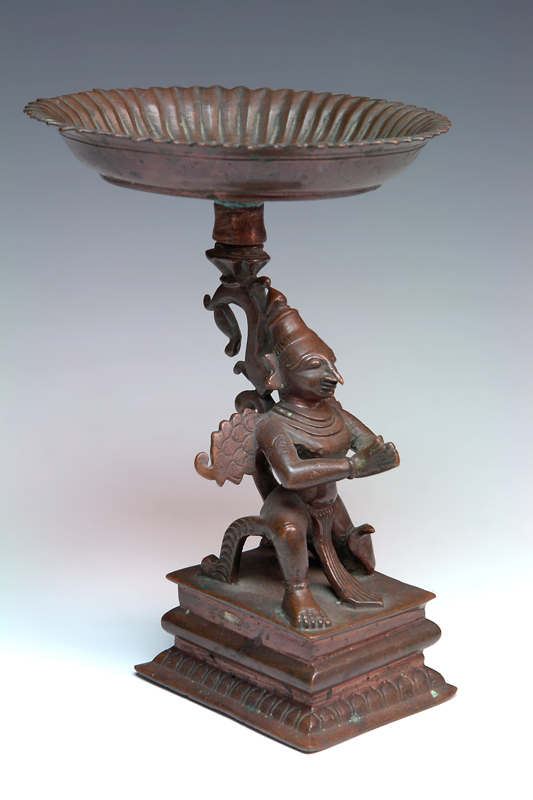 A SOUTH INDIAN COPPER OFFERING PLATE, supported by a kneeling Garuda, at back a stylised dragon and a peacock 17.5cm diameter