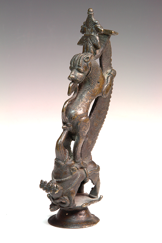 A BRONZE YALI FIGURE, standing on an Elephant, its trunk meeting Yali's tail 22.5cm high