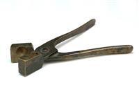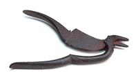 SEVEN INDIAN CAST METAL OBJECTS, including a steel dagger sharpener, betelnut cutter, two combs, iron tongs, soldering rod and elephant bell. The dagger sharpener, 15cm long