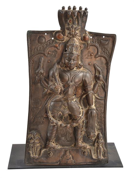 AN 18TH CENTURY REPOUSSE PLAQUE, VIRABHADRA, large holding handle at back, collected from Maharashtra region, 30 x 15.5cm