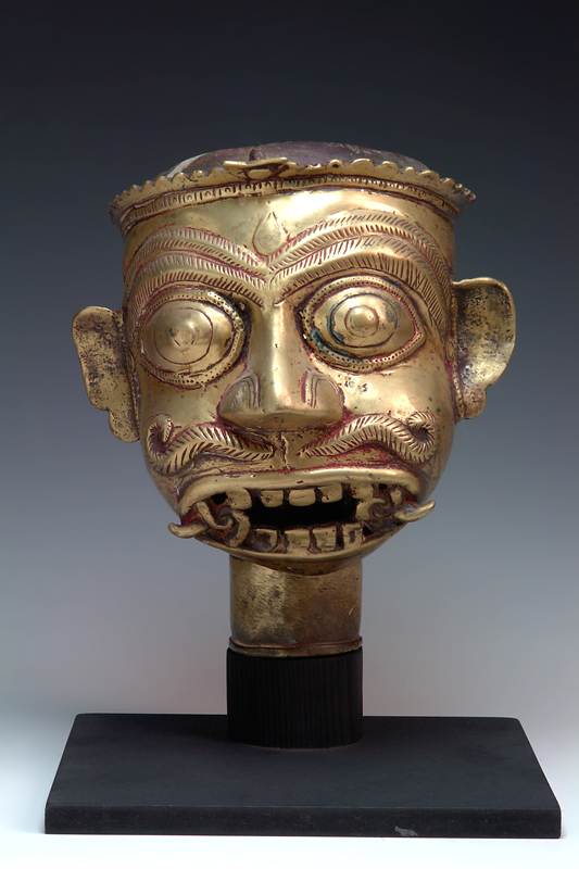 A 19TH CENTURY BRASS SHIVA HEAD, bulging eyes, open mouth with teeth and two fangs, a tilak on forehead, applied moustache, housed on Lingam stand, open top for insertion of stone lingam, collected from Maharashtra State 33cm high