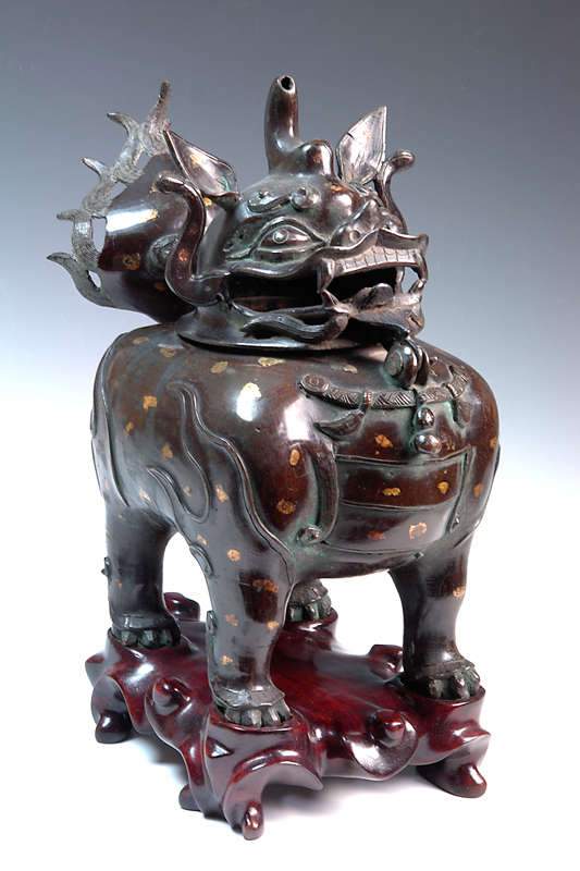 A BRONZE FO DOG CENSER, gilt inclusions, 29 x 26cm base not measured