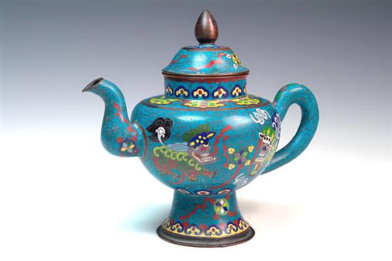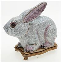 THREE CLOISONNE ITEMS, including rabbit, teapot and lidded jar. The rabbit 17.8 x 22.8cm, stand not measured