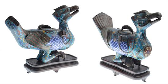 A PAIR OF CLOISONNE DECANTER DUCKS, decorated with a lotus flowers, loss to one handle 27.5 x 22.5cm each, stand not measured