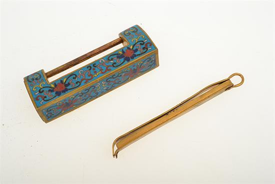 A COLLECTION OF CHINESE BRASS LOCKS, AND A CLOISONNE LOCK AND KEY, in varying shapes and styles.