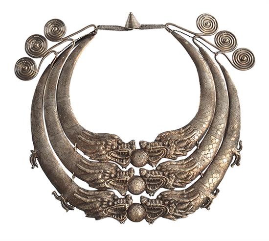 A MEO TRIBE DRAGON NECKBAND, 6 DRAGONS, each dragon with a pearl in mouth, tiny claws at sides, engraved scales along bodies, tails ending in coils, 30 x 25cm