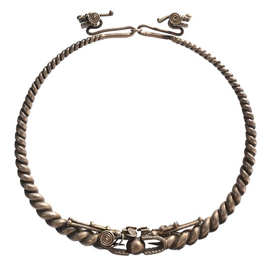 A SILVER MEO TRIBE NECKBAND, a coiled silver band with a dragon each side, 20cm diameter