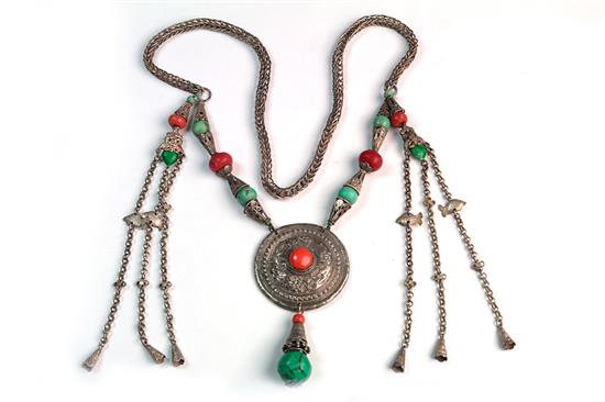 AN EARLY 20TH CENTURY CHINESE SILVER NECKLACE, a plaited silver chain with turquoises and red corals, large pendant silver with malachite and red coral, 53cm long