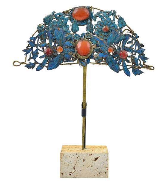 AN EARLY 20TH CENTURY KINGFISHER FEATHER HAIRPIN, modelled as two butterflies amongst flowers, inset with carnelian roundels, some damage, 17.5 x 7.5cm