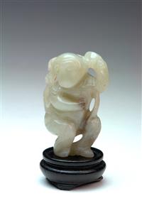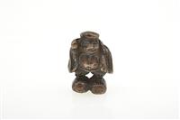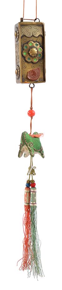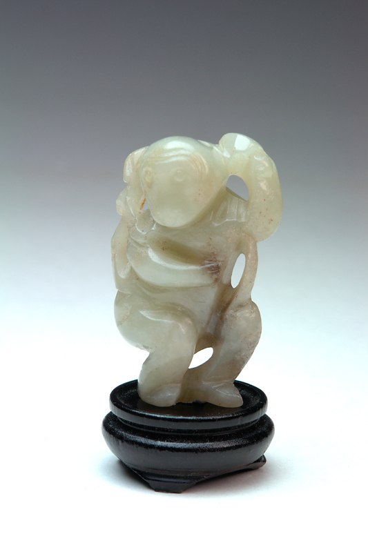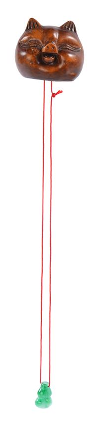 FOUR CHINESE TOGGLES, including tobacco box, wooden pig, jade monkey and bronze traveller. The tobacco box 7.5 x 3.5cm, with pendant 22.8cm long