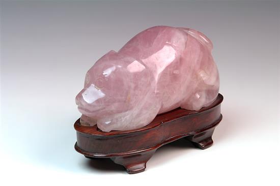 A ROSE QUARTZ CARVING OF A DOG, head resting on paws, 12.5cm long