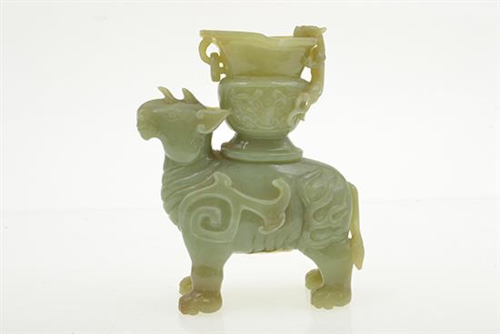AN ARCHAIC STYLE JADEITE INCENSE BURNER, modelled as a rhinoceros, with a chilong carved at right edge, a loose carved ring on left hand, housed on wooden base 15.5 x 14cm long, base not measured