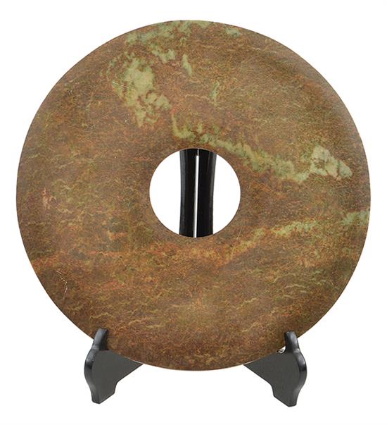 A HAN PERIOD STYLE STONE MONEY DISC, housed on stand, 40cm diameter