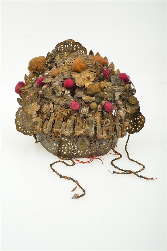 AN ELABORATE CHINESE LADIES HEADGEAR, adonred with metal flowers, leaves and butterflies, some gilding worn, 22.5cm high