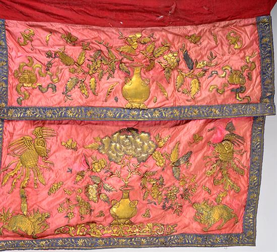 AN ELABORATE 19TH CENTURY ALTAR CLOTH, appliquéd with gilded copper auspicious symbols, some faults 104 x 91cm