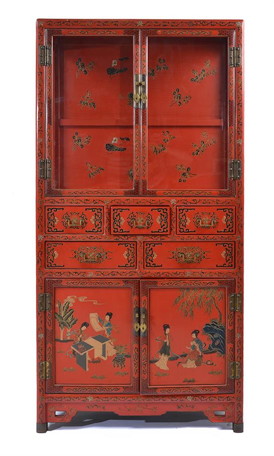A CHINESE FOUR DOOR, FIVE DRAWER RED AND BLACK LACQUERED DISPLAY CABINET, with bronze mounts, 1.78cm high, 89cm wide, 45cm deep