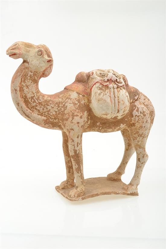 A LARGE TERRACOTTA CAMEL, TANG PERIOD, a Taotie mask on each side on saddle bag, 7 – 12th Century, 39cm high.